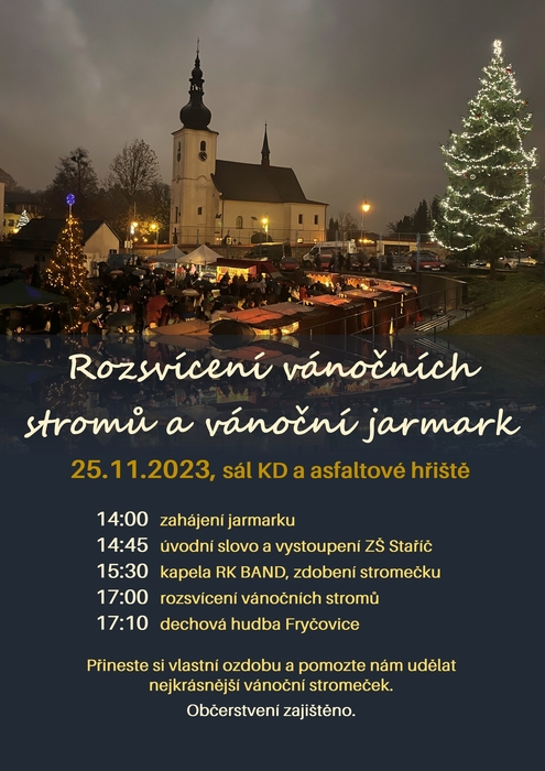 Úvod > Život v obci > Aktuality > ROZSVÍCENÍ VÁNOČNÍCH STROMŮ A VÁNOČNÍ JARMARK 25.11.2023