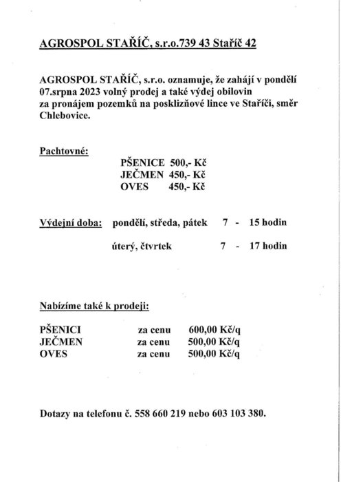 Úvod > Život v obci > Aktuality > Výdej obilí - Agrospol Staříč